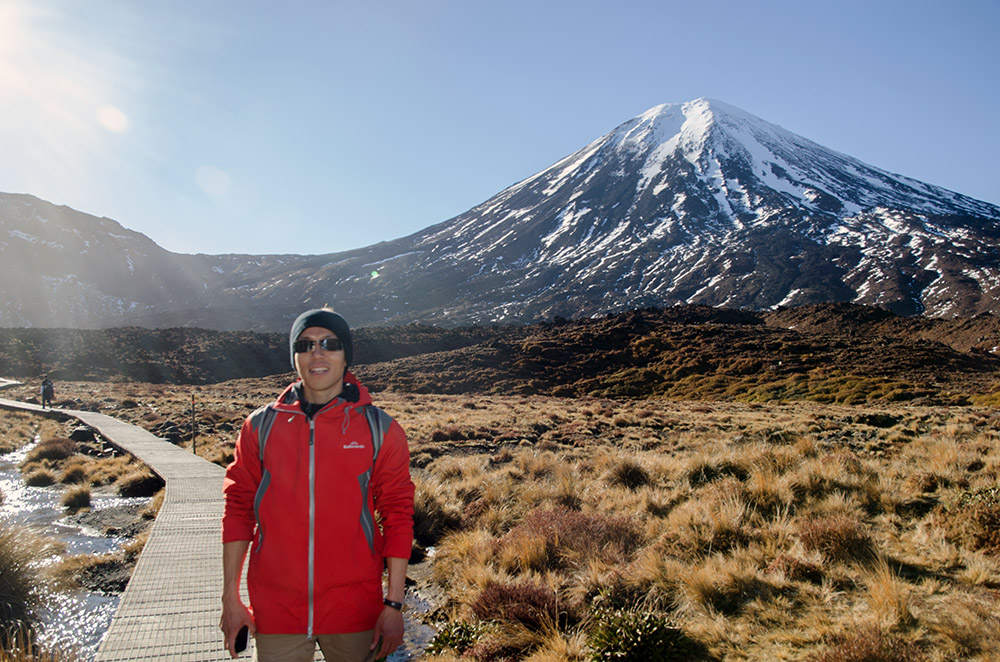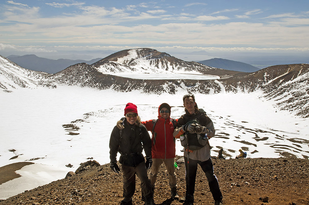 三位室友德國人率先快步向前衝,不一會就變成了遠方的小黑點,我還是不要貪快得好,畢竟我一日健行二十公里的經驗為零,更何況是有積雪的山,對我來說,今天需要的是耐力而不是爆發力,調整好裝備與暖身一下,我跨出前往末日火山的第一步,今天我要穿越東格里羅山(Mount Tongariro)!